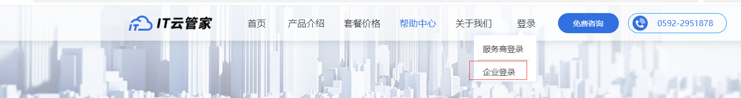 1.打开浏览器(如:IE,谷歌,火狐,360浏览器等),打开IT云管家官网:http://ityungj.com,点击登录,选择企业登录。